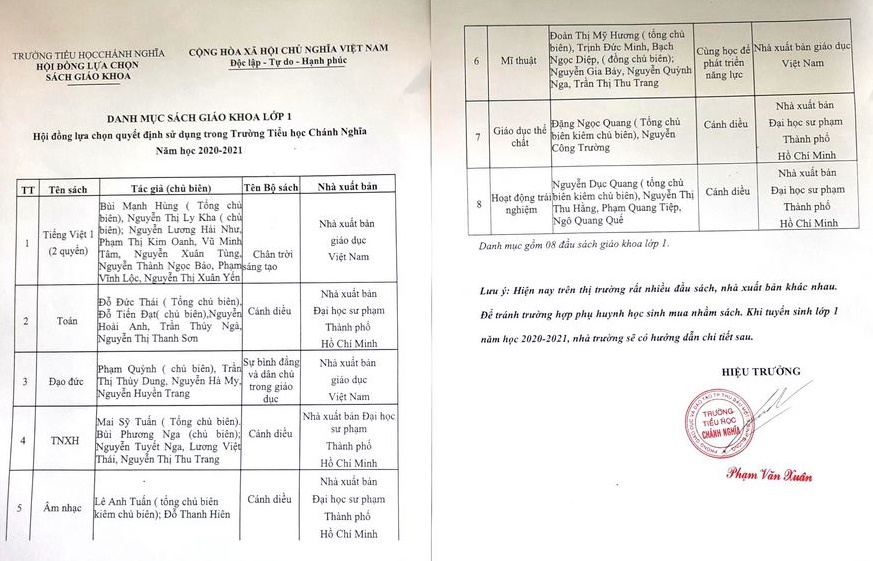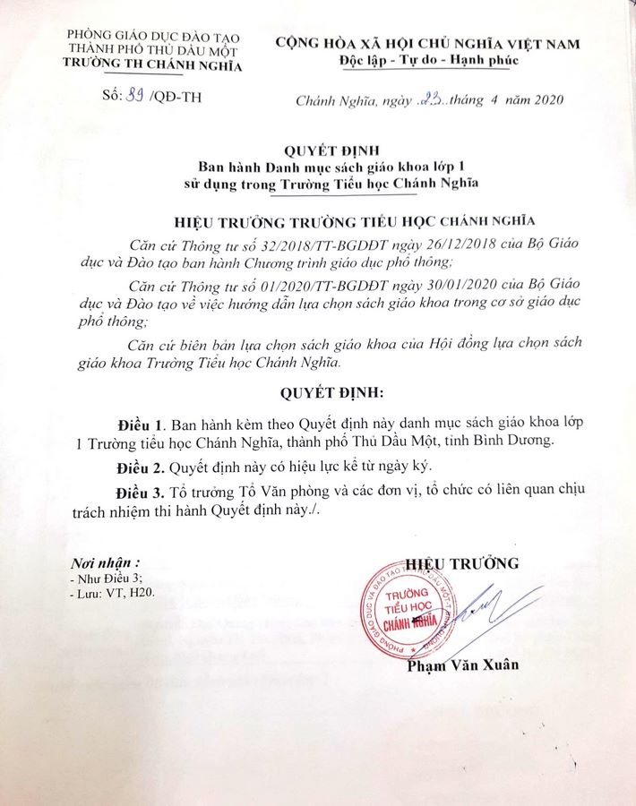- Công văn số 39/QĐ-TH ngày 23 tháng 4 năm 2020: Quyết định về việc ban Danh mục SGK Lớp 1 sử dụng trong Trường Tiểu học Chánh Nghĩa