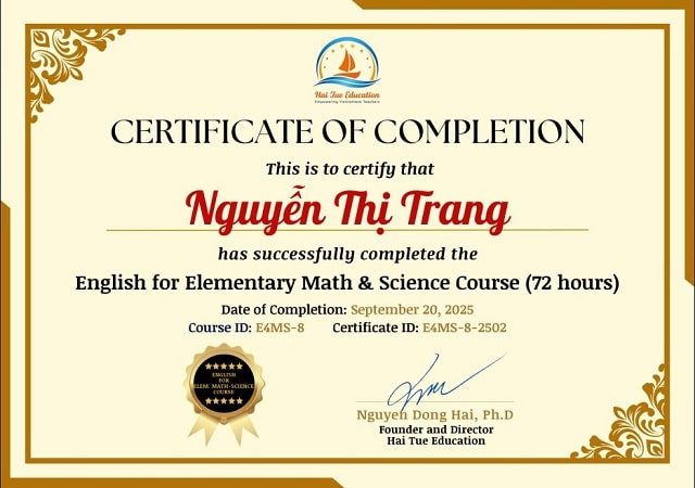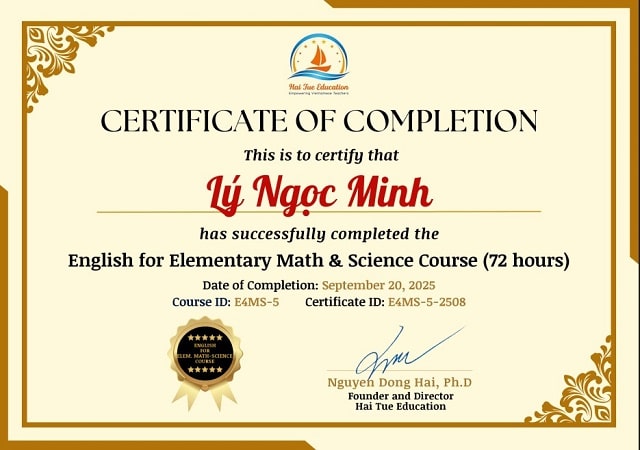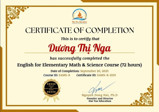 Khóa học được triển khai từ ngày 05/3/2025, nhằm trang bị cho giáo viên những kiến thức và phương pháp giảng dạy tích hợp, giúp nâng cao năng lực sử dụng tiếng Anh trong các môn học tự nhiên và tạo nền tảng cho chương trình dạy học song ngữ tại trường. Các cô của trường Tiểu học Chánh Nghĩa đã nỗ lực không ngừng, vượt qua nhiều khó khăn và thử thách, để hôm nay có được thành công xứng đáng và ghi dấu ấn trong hành trình phát triển chuyên môn của mình